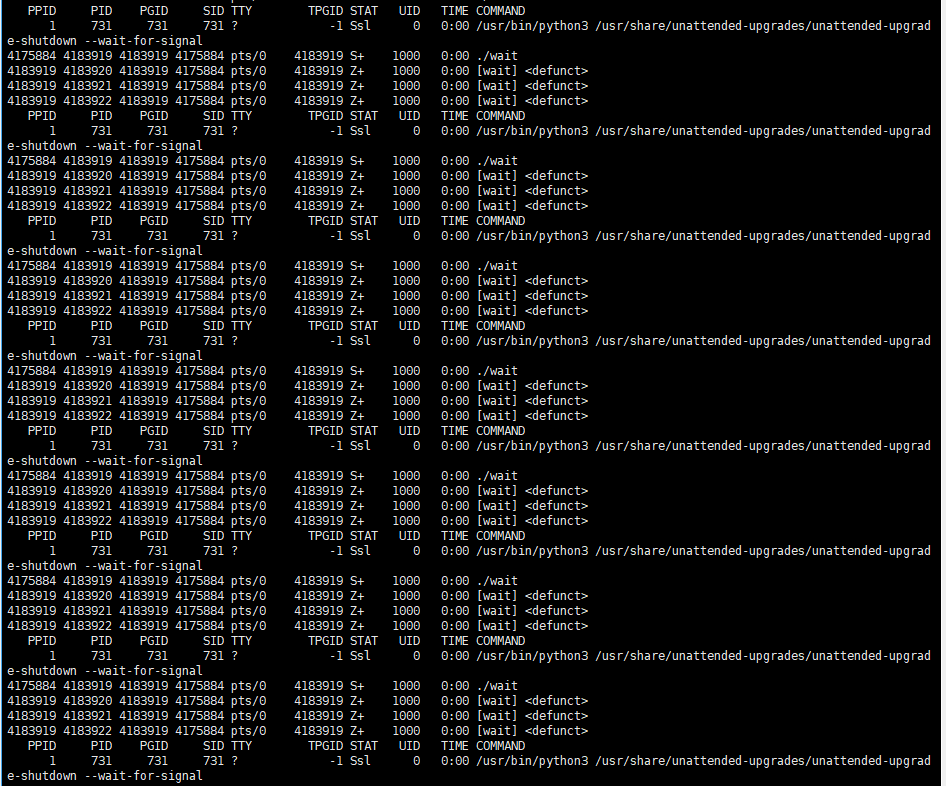 我们发现3个创建的子进程的僵尸状态消失了,并且退出。