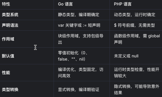 Go 和 PHP 在变量声明上的第一个重大差异源于它们的类型系统设计。Go 是静态类型语言,变量类型在编译期确定且不可变更;PHP 是动态类型语言,变量类型由运行时的值决定,可随时变化。这种差异直接影响了两种语言的变量声明逻辑和使用场景。