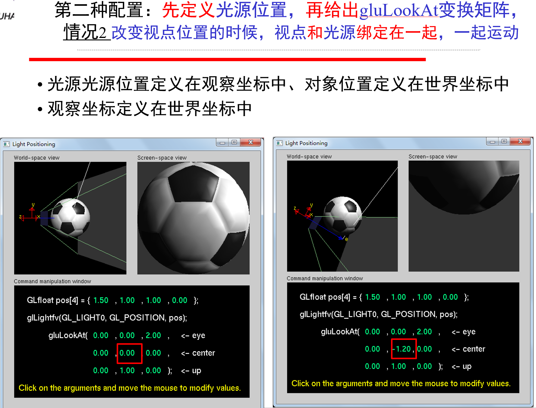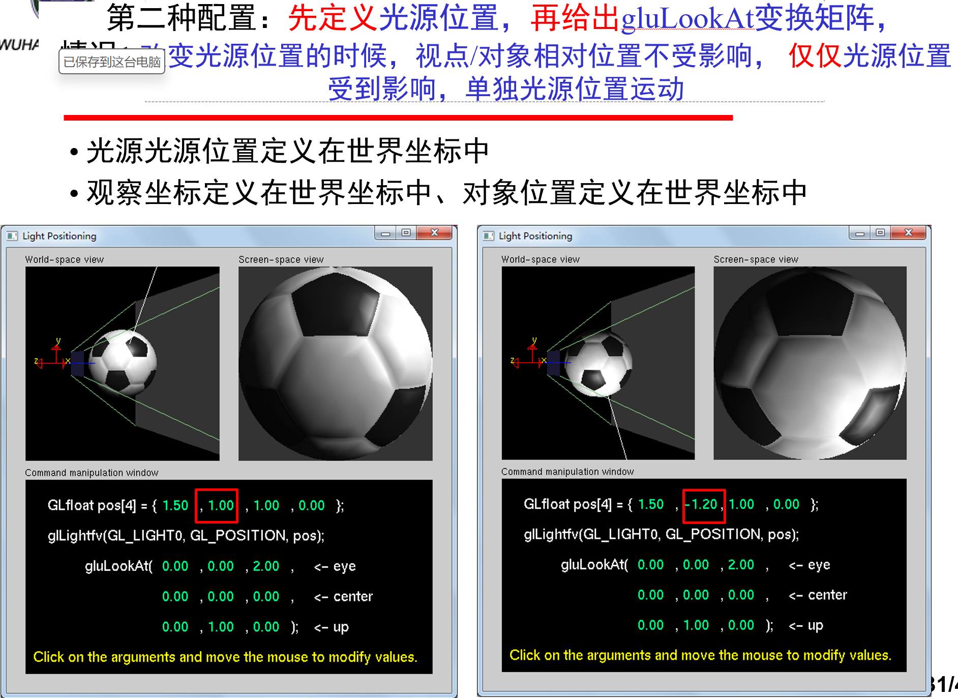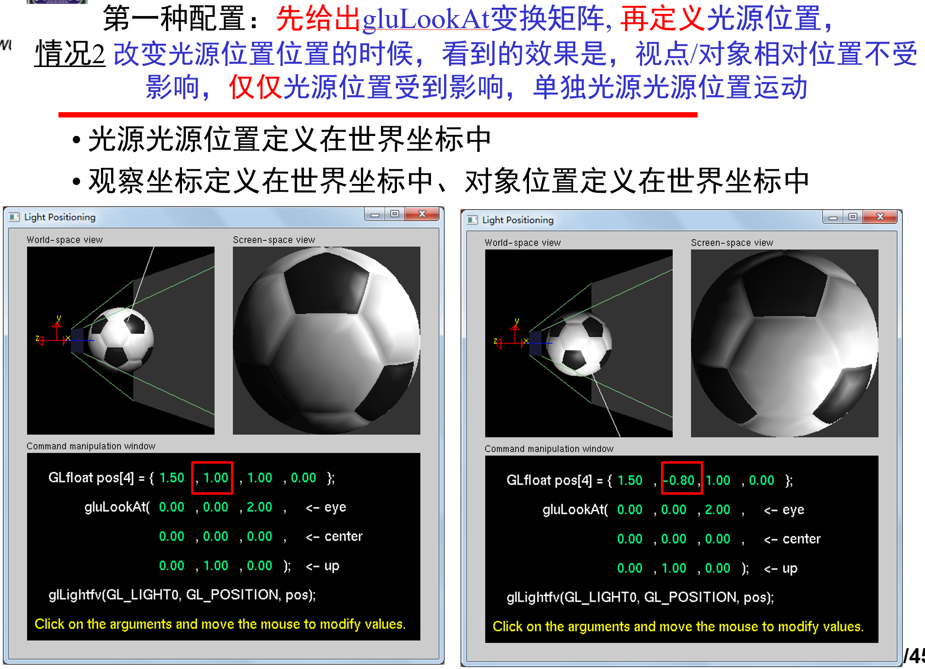 (1)固定光源,移动对象:初始化光源位置,设置变换后,再定义对象