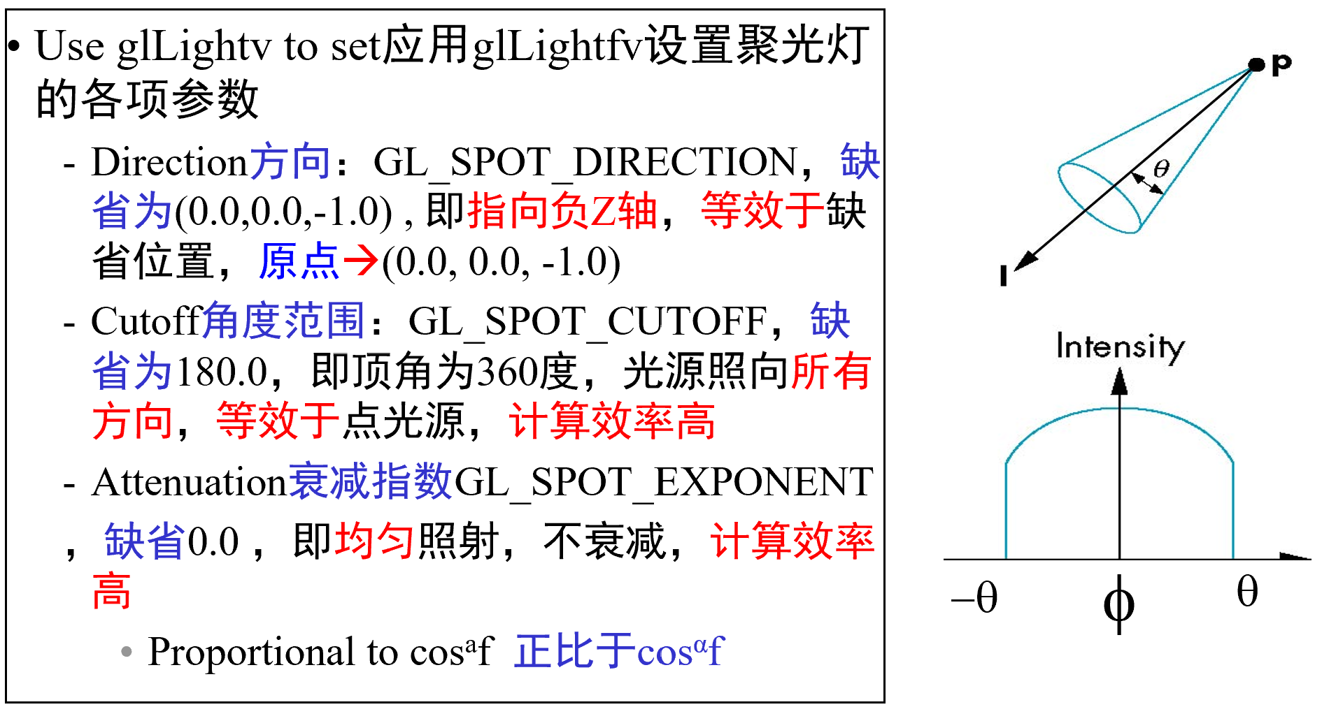 而对OpenGL中的每个光源,都有环境光、漫射光和镜面光项,相关参数有:光源颜色项(GL_AMBIENT, GL_DIFFUSE, GL_SPECULAR)、位置/方向(GL_POSITION)、衰减项(GL_CONSTANT_ATTENUATION, GL_LINEAR_ATTENUATION, GL_QUADRATIC_ATTENUATION)、聚光灯参数(GL_SPOT_CUTOFF, GL_SPOT_DIRECTION, GL_SPOT_EXPONENT)。