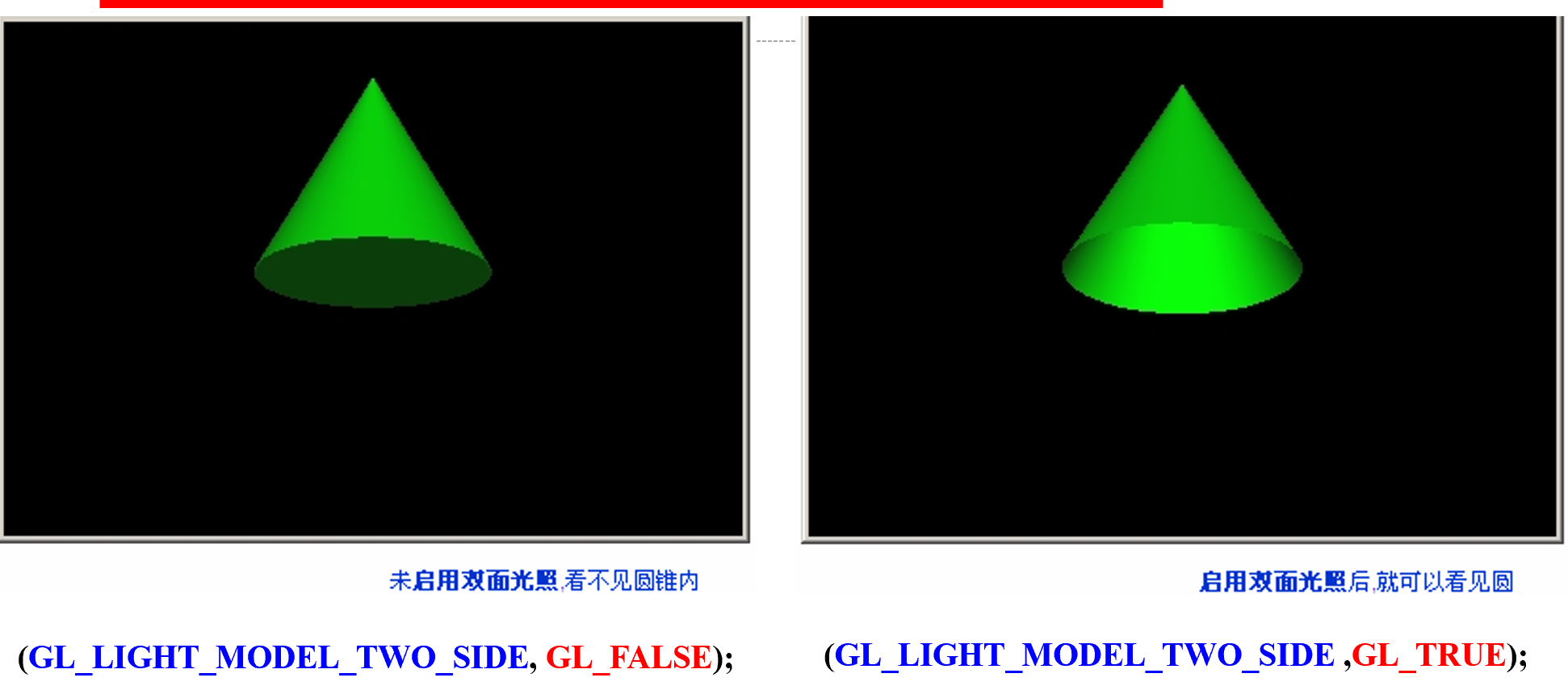 ②GL_LIGHT_MODEL_TWO_SIDED 表示单面还是双面光照处理。(GL_LIGHT_MODEL_TWO_SIDE, GL_FALSE); 是缺省值,单独对多边形的外面进行明暗处理,如果是GL_TRUE则启用双面光照。