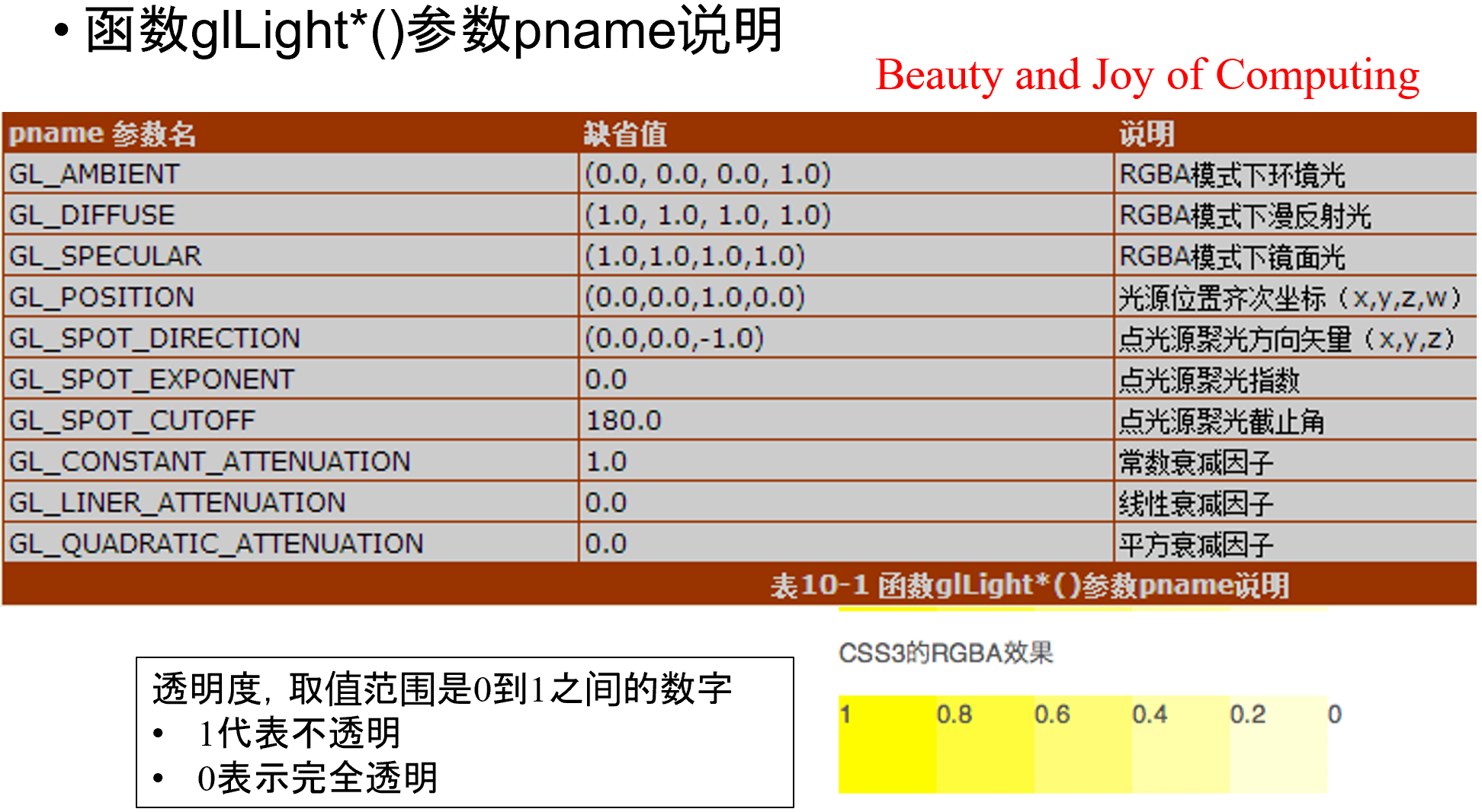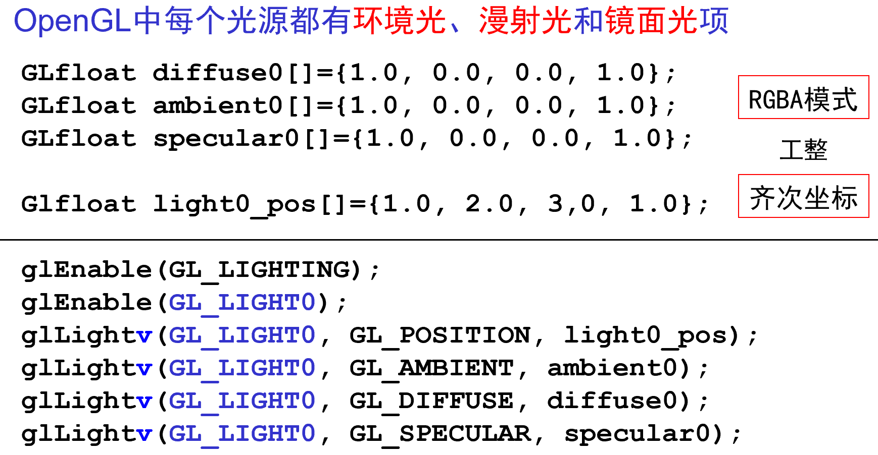5、明暗处理计算由下述命令启用glEnable(GL_LIGHTING),如果光照被激活,glColor()命令将被忽略。此外,还必须单独激活每个光源,最多同时使用八个光源(GL_LIGHT0, GL_LIGHT1, ... , or GL_LIGHT7):
