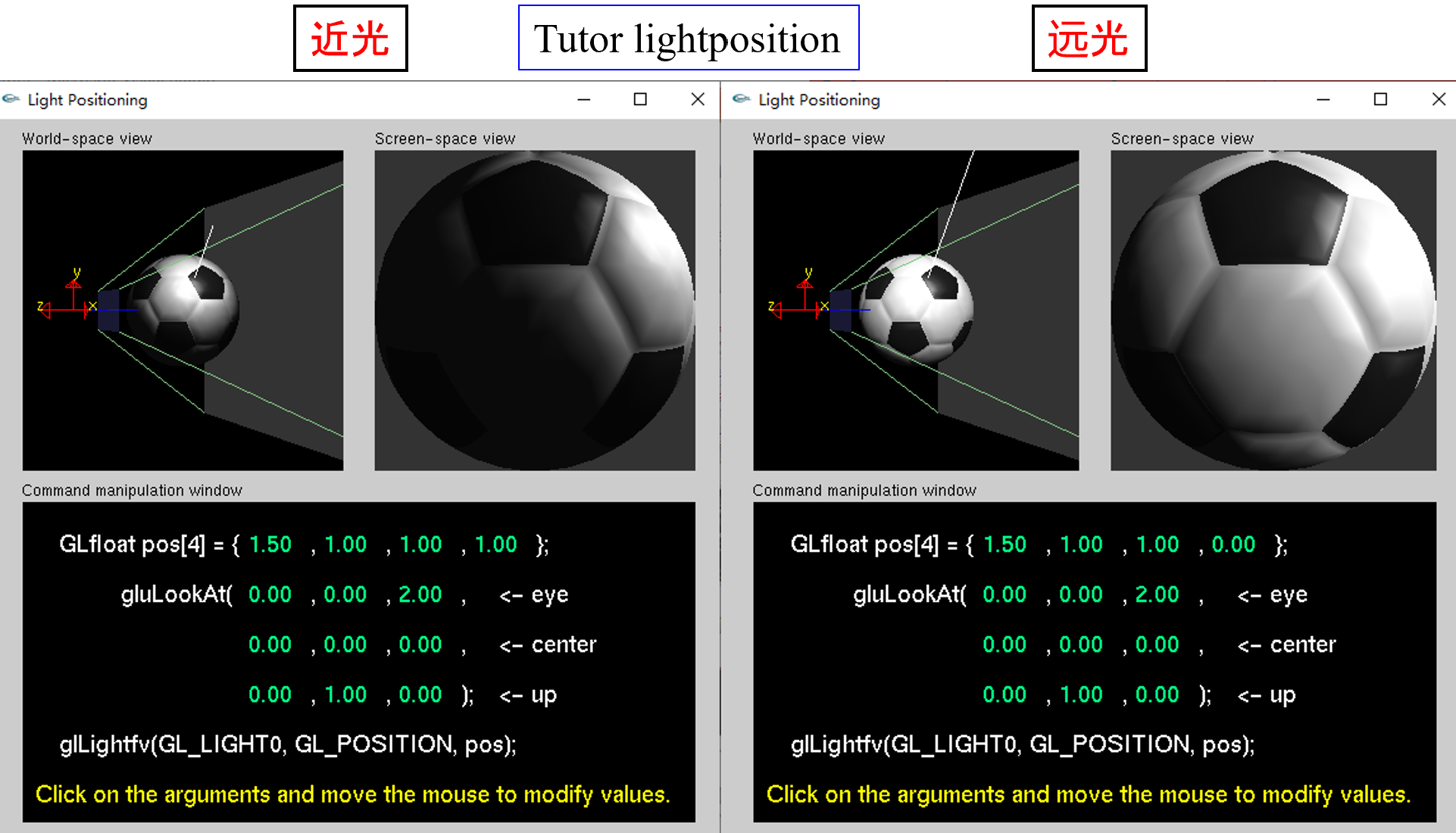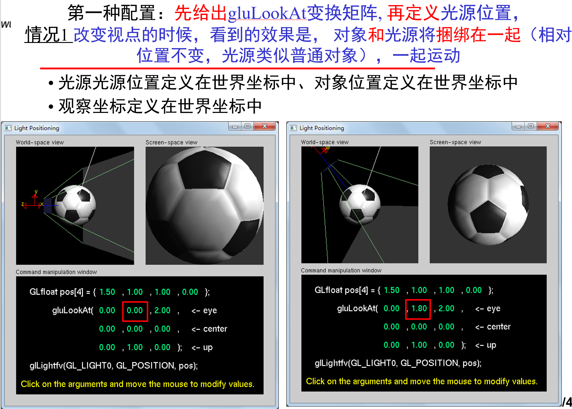 ③而对移动光源,光源是几何对象,它的位置或方向受模型视图矩阵的影响。把光源的位置和方向设置函数放置在不同的地方,可以达到不同的效果: