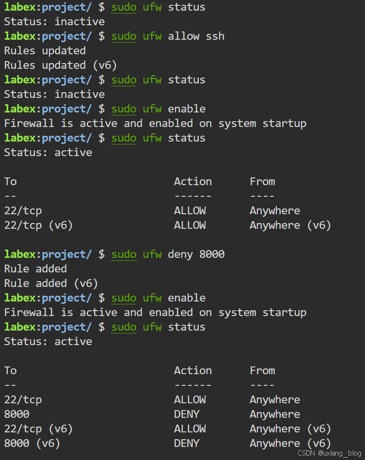 配置防火墙规则后,运行sudo ufw status应该显示防火墙已激活,端口 8000 被拒绝,SSH(端口 22)被允许。