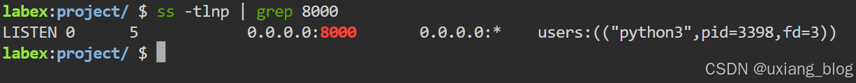 LISTEN 0 5 0.0.0.0:8000 0.0.0.0:* users:(("python3",pid=3765,fd=3))