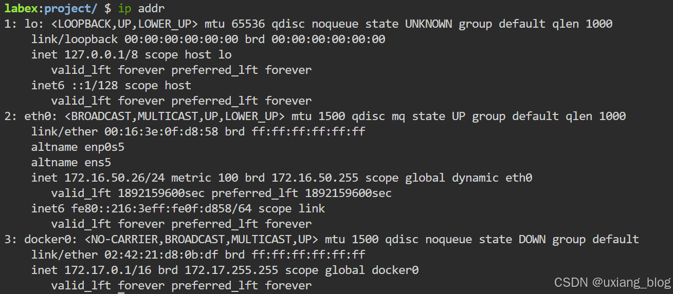 运行命令后,您应该会看到类似lo(loopback) 和eth0(或类似信息) 的网络接口输出。查看主接口的状态------它应该显示UP为活动状态。