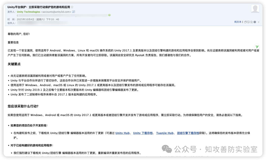 尊敬的用户, 您好!重要信息已发现一个安全漏洞,使用适用于 Android、Windows、Linux 和 macOS 操作系统的 Unity 2017.1 及更高版本以及团结引擎构建的游戏和应用程序会受到影响。尚无证据表明该漏洞被利用或者对用户或客户产生了任何影响。我们已主动提供修复该漏洞的方案,所有开发者均可立即获取。该漏洞由安全研究员 RyotaK 负责报告,我们感谢他与我们的合作。关键要点尚无证据表明该漏洞被利用或者对用户或客户产生了任何影响。Unity 与平台合作伙伴进行了密切协作,这些合作伙伴已采取进一步措施来保障其平台安全并保护终端用户。使用适用于 Windows、Android、macOS 或 Linux 的 Unity 2017.1 或更高版本以及团结引擎发布的游戏或应用程序可能存在该漏洞。Unity 针对 Unity 2019.1 及之后每个主要版本和次要版本的 Unity 编辑器和团结引擎编辑器发布了更新。Unity 发布了二进制修补程序来修补自 2017.1 版本起构建的应用程序。您应该采取什么行动?如果您使用适用于 Windows、Android 或 macOS 的 Unity 2017.1 或更高版本或者团结引擎开发并发布了游戏或应用程序,需立即采取行动。为持续保障您用户的安全,请务必查阅以下指南。如果您的项目仍处于开发阶段:在构建和发布之前,下载相关 Unity/团结引擎 编辑器版本适用的补丁更新(可通过 Unity Hub、 Unity 下载存档、 Tuanjie Hub、 团结引擎下载存档获取)。这将确保您的发布版本获得充分保护。对于已经构建好的游戏和应用程序:我们强烈建议下载相关 Unity/团结引擎 编辑器版本适用的补丁更新,重新编译并重新发布您的应用程序。对于不愿重新构建项目的开发者,我们提供了一个工具,可以对自 2017.1 以来构建的 Android、Windows 和 macOS 应用程序进行修补。您可以在此处获取该工具。对于 Android 或 Windows 应用程序,我们正在实施一些额外的保护措施:如果您的 Android 应用程序通过 Google Play、其他第三方 Android 应用商店或直接下载的方式进行分发: 作为额外的防护层,Android 内置的恶意软件扫描和其他安全功能将有助于降低用户因该漏洞而面临的风险。 但即便如此,您仍旧迫切需要对受影响的应用程序进行补丁更新。(这些保护措施不适用于与 Google 无关的基于 AOSP 的平台。)如果您的应用程序面向 Windows: 对于 Windows 应用程序,Microsoft Defender 已更新,可以检测并阻止该漏洞。 Valve 将为 Steam 客户端提供额外的保护。如果您的应用程序采用了防篡改或反作弊解决方案:为了维持这些保护措施,您需要使用相关 Unity/团结引擎 编辑器版本适用的补丁更新来重新构建您的项目并重新部署。无法对现有应用程序进行修补,因为这会触发篡改保护。其他平台:对于 Horizon OS:Meta 设备已实施缓解措施,以防止在 Horizon OS 上运行的存在该漏洞的 Unity/团结引擎 应用程序被利用。对于 Linux:与 Android、Windows 和 macOS 相比,该漏洞在 Linux 平台上的风险要低得多。对于 Unity/团结引擎 支持的所有其他平台(包括 iOS),目前尚未发现该漏洞可被利用的证据。为了获得更周全的保护,我们始终建议您使用所用 Unity/团结引擎 版本的最新补丁进行更新。消费者指南:尚无证据表明该漏洞被利用或者对用户或客户产生了任何影响。建议您的用户将设备和应用程序更新到最新版本,启用自动更新,并保持杀毒软件处于最新版本。鼓励您的用户遵循安全方面的最佳实践,包括避免下载可疑文件以及定期更新所有软件。我们的承诺:Unity 致力于保障平台、客户及更广泛的社区的安全与完整性。透明沟通是这一承诺的核心,我们将根据需要,持续公布或更新相关信息。如需了解全面的技术细节,请查阅我们的 补丁工具与修复指南、 安全公告 以及 CVE-2025-59489。如有任何问题或需要帮助,请通过 unitychina-security@unity.cn联系我们。此外也请查阅常见问题解答。您对此事项的积极关注对于保障用户安全至关重要,并能确保您始终恪守最高安全标准。