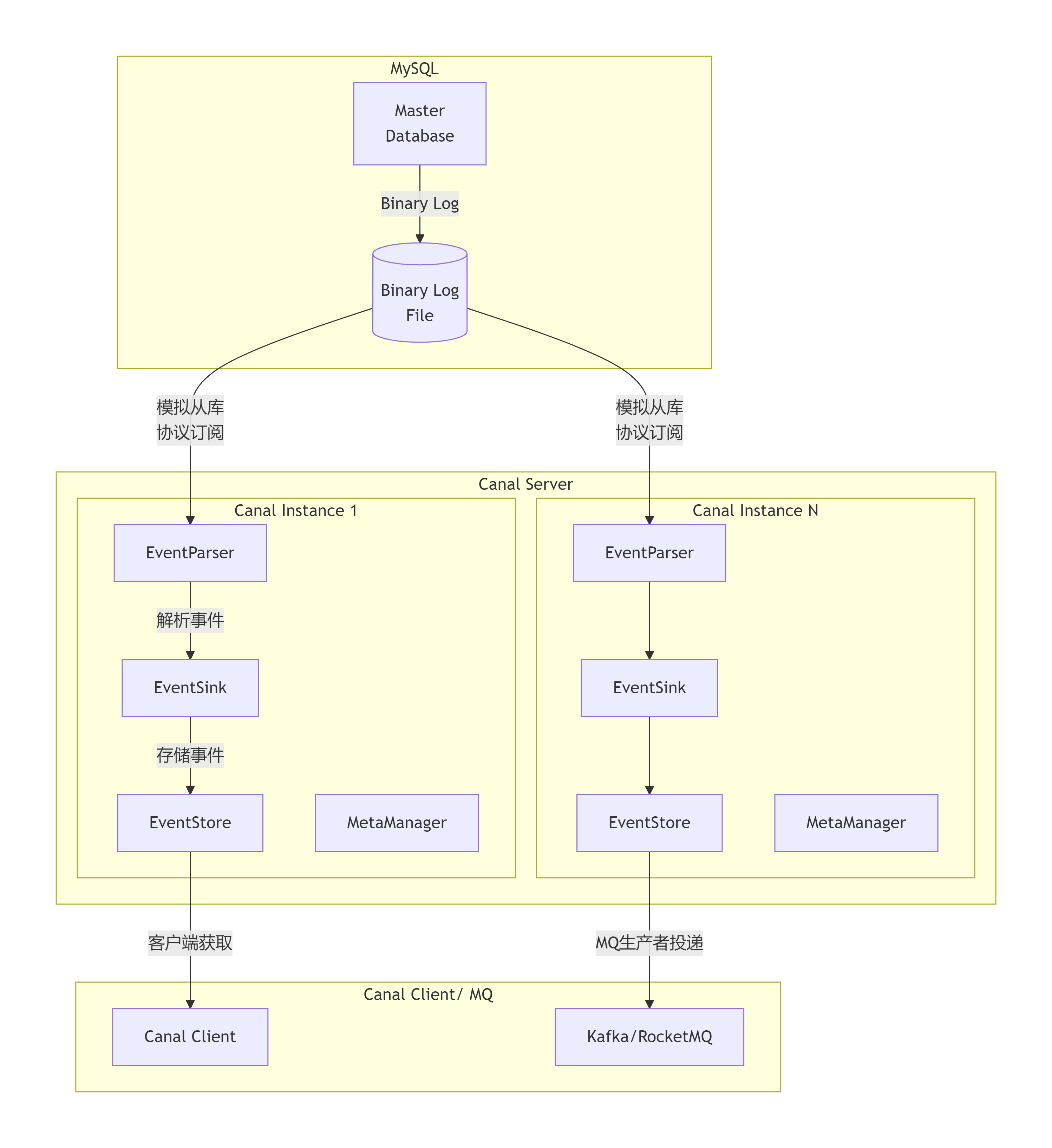 这个过程使得Canal能够实时 捕获数据库的变更(如INSERT、UPDATE、DELETE),从而实现数据的增量订阅与消费。