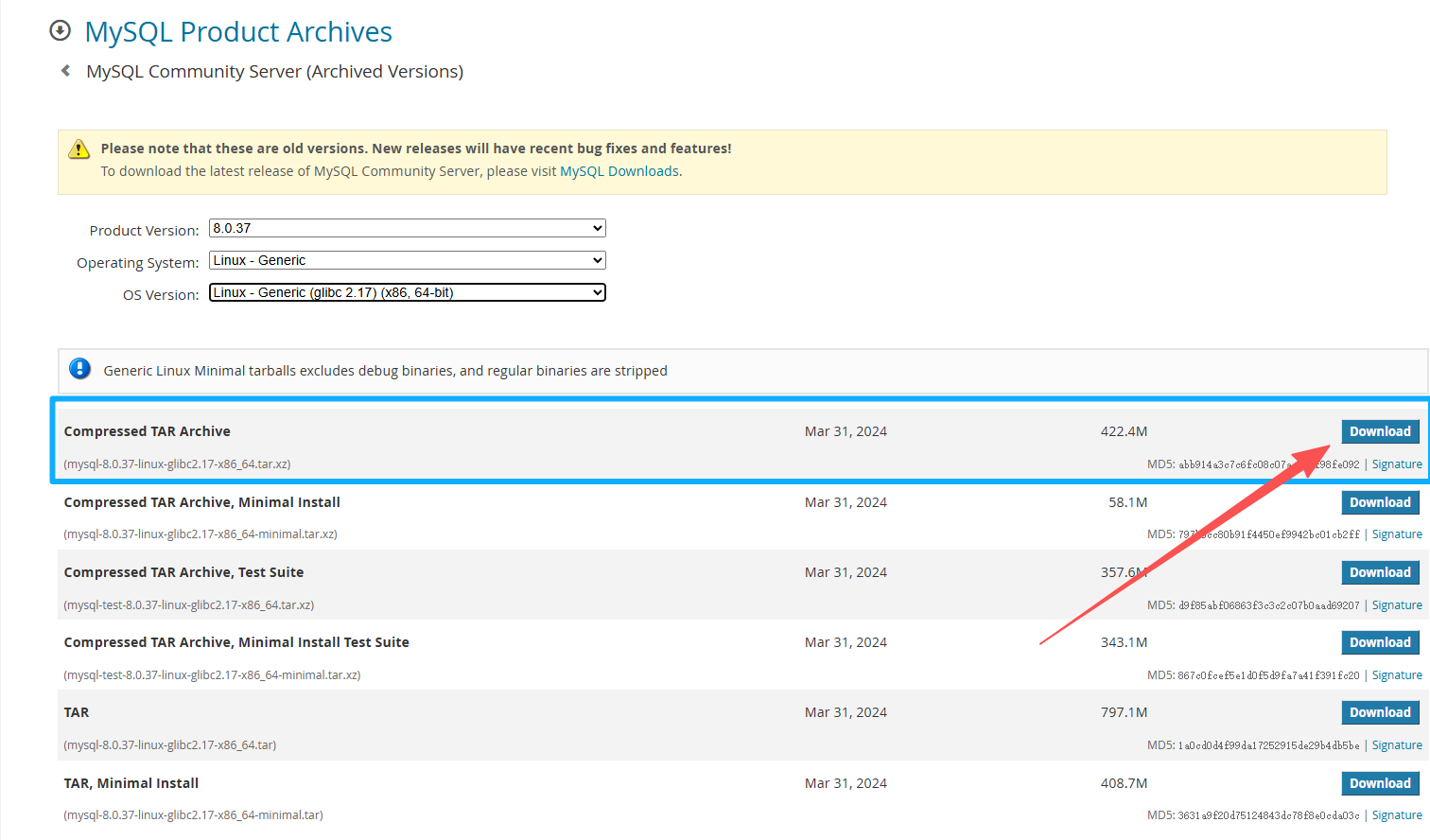wget https://downloads.mysql.com/archives/get/p/23/file/mysql-8.0.37-linux-glibc2.17-x86_64.tar.xz