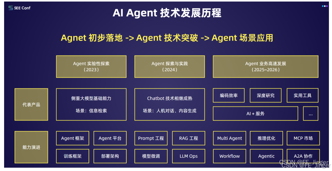 - 实验性探索(2023):聚焦大模型基础能力,以信息检索、简单对话为核心场景,验证Agent的可行性;