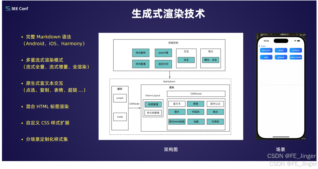(注:此处截取PPT中生成式渲染架构图,展示"Markdown解析→样式配置→布局管理→富文本渲染"的流程)