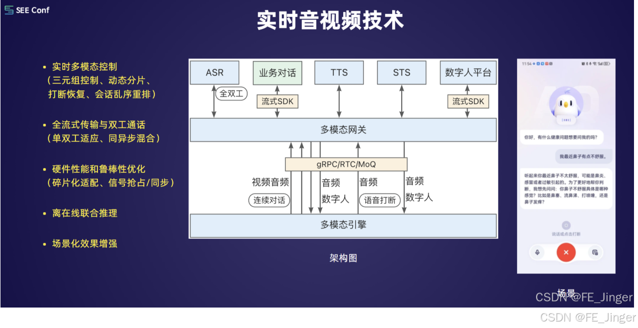 - 多模态控制:实现三元组控制、动态分片、打断恢复、会话乱序重排;