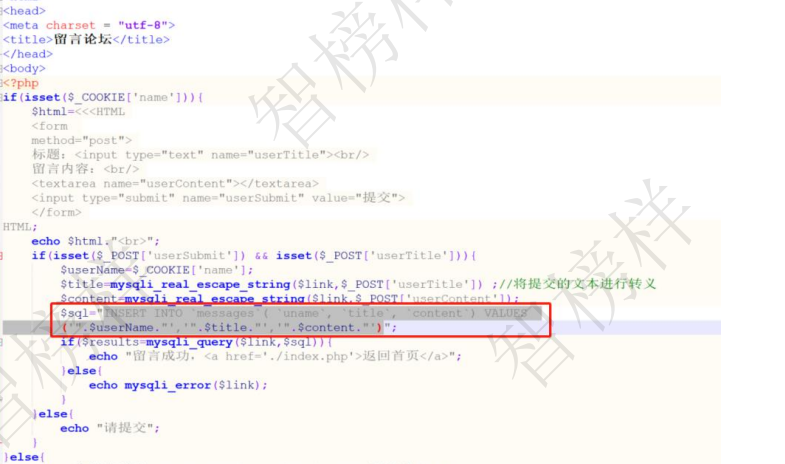 INSERT INTO` messages` ( `uname`, `title`, `content`) VALUES('".$userName."','".$title."','".$content."')