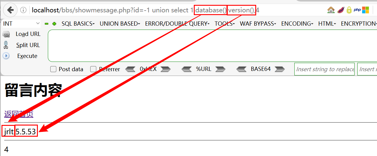 (5)数据库名,版本号等,在回显的位置进行编写sql语句。查到数据库为jrlt。