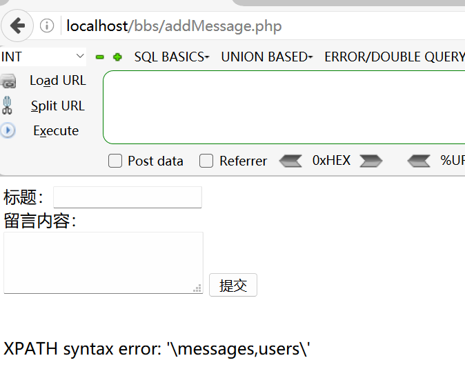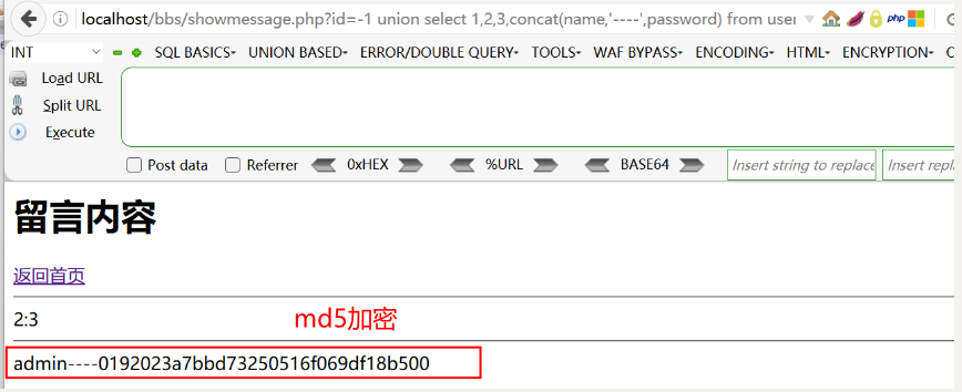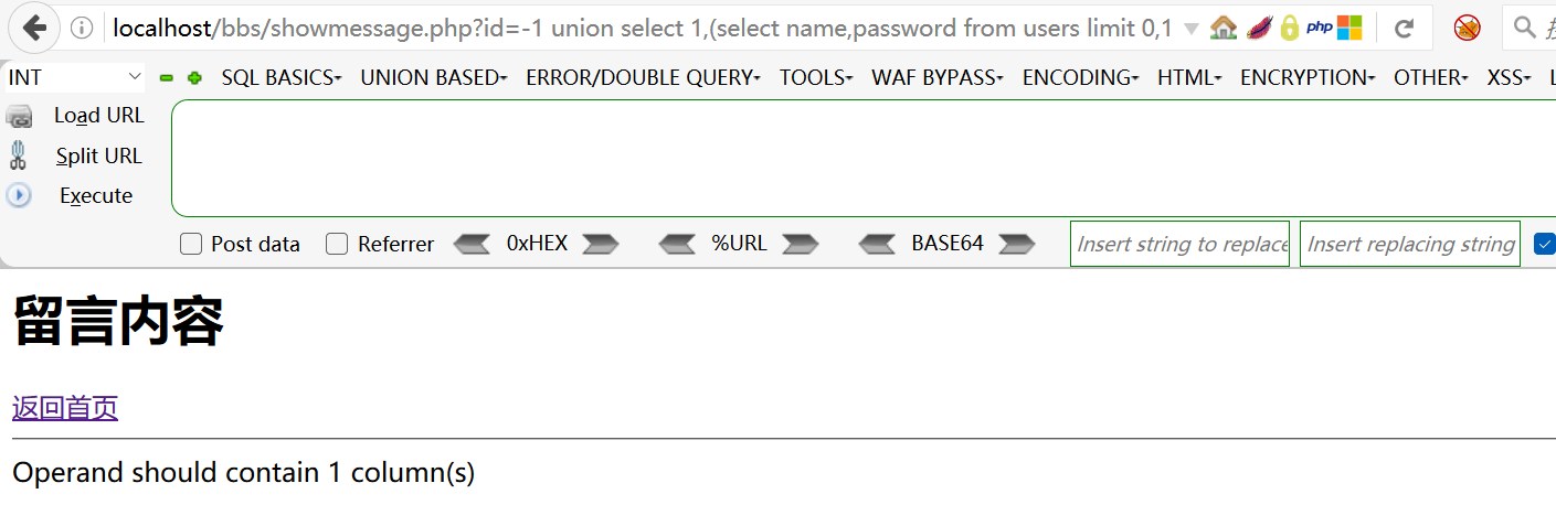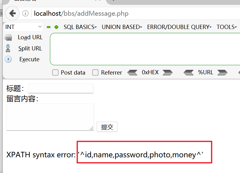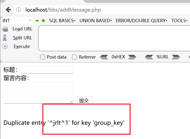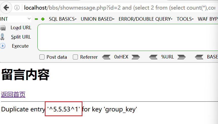 使用bbs的靶场,登录admin/admin123进入之后,进行留言,然后再在url复制group by重复键冲突命令,然后就输出以下内容。