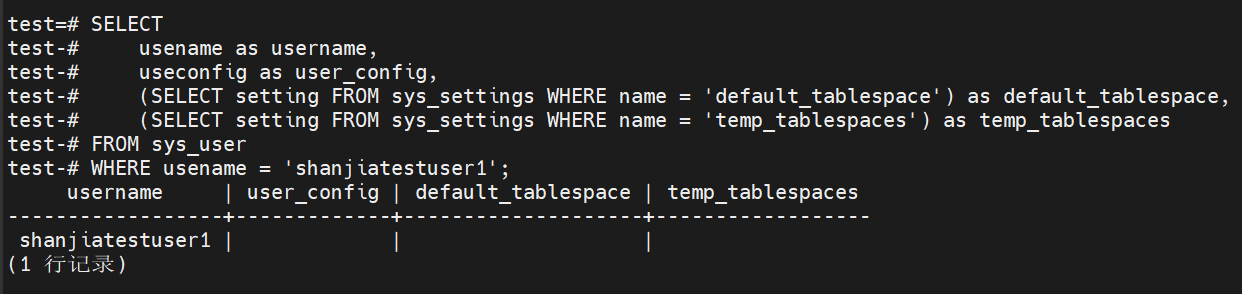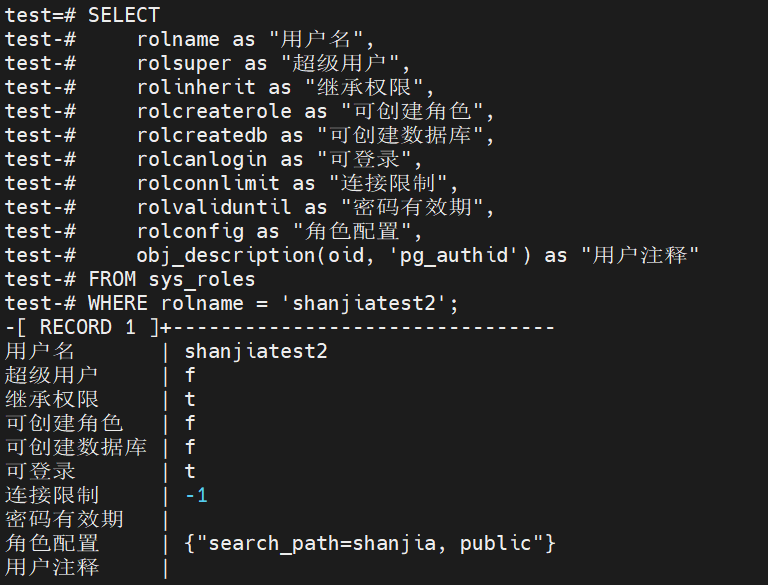 SELECT EXISTS(SELECT 1 FROM sys_roles WHERE rolname = 'shanjiatest2') INTO user_exists;