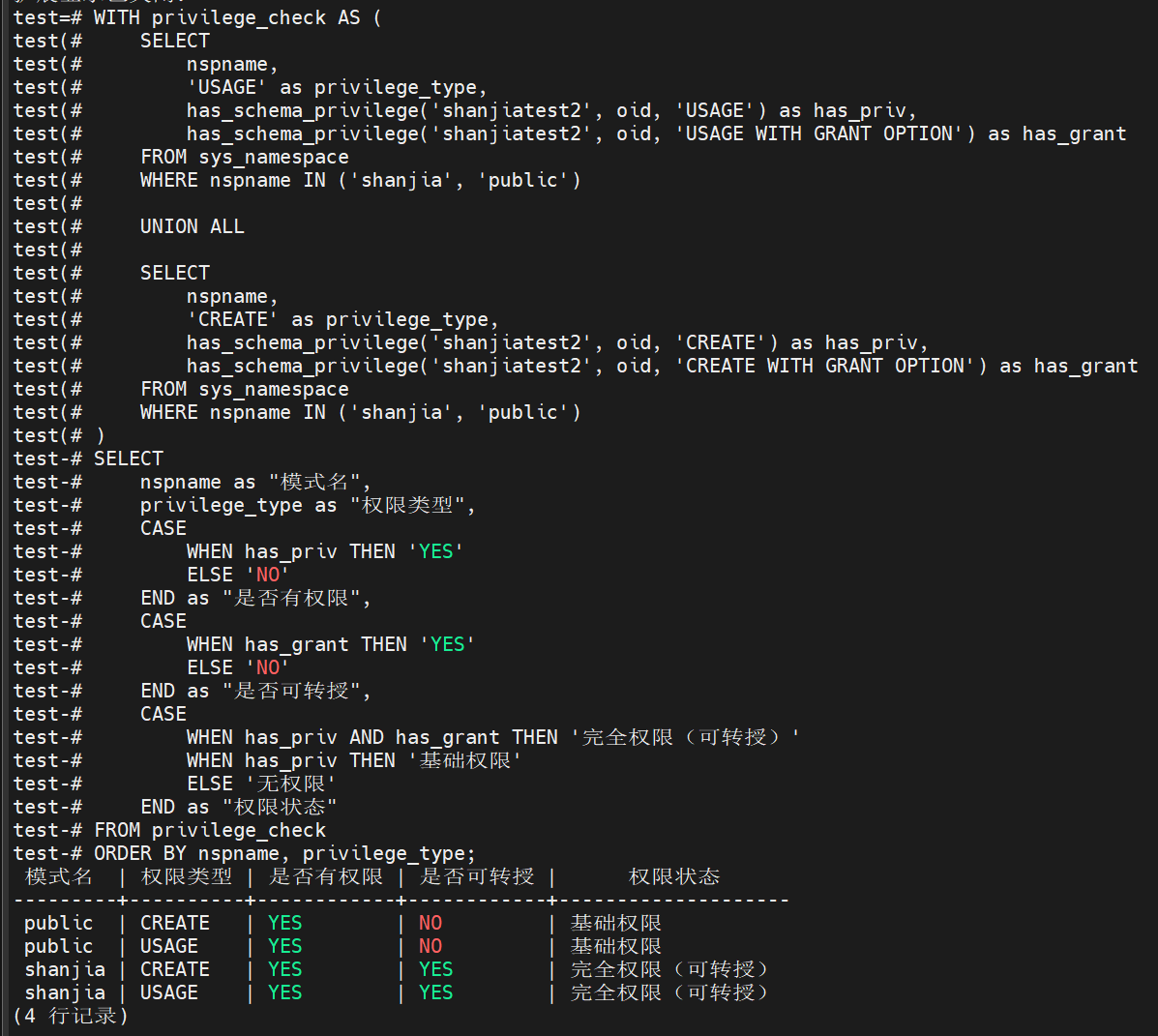 RAISE NOTICE 'Schema使用权限: %', CASE WHEN user_has_schema_usage THEN '✓ 有权限' ELSE '✗ 无权限' END;