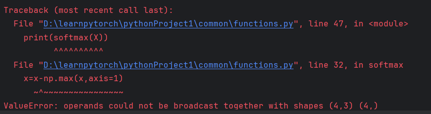 对矩阵和向量的溢出处理不同,作为向量选出一个最大值max之后每一项均减去。在矩阵中,对应为每一行选出一个最大值,但是在代码中选出最大值后并不会以列的形式表现,而是表现为向量(行),因此在行列不等的情况下会出现矩阵与向量无法相减的报错。