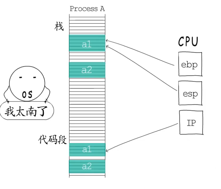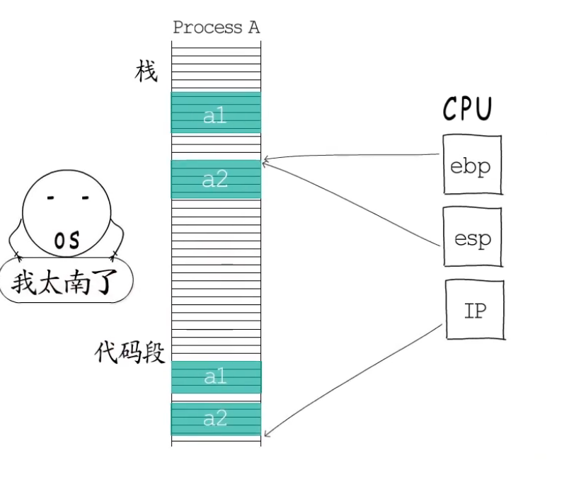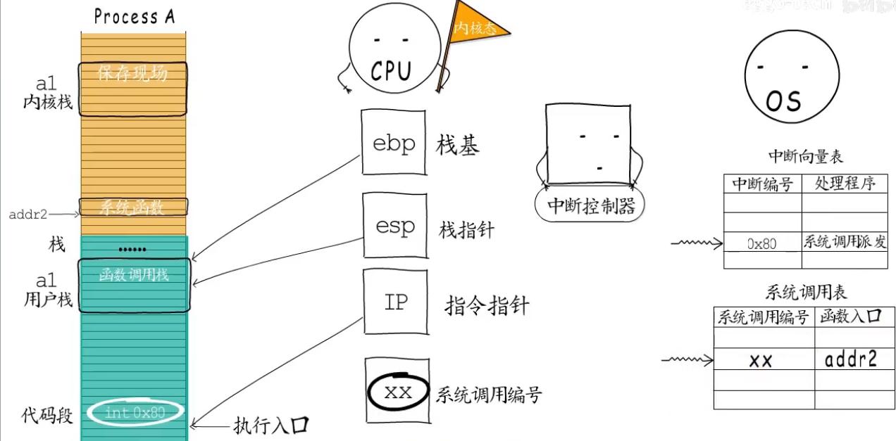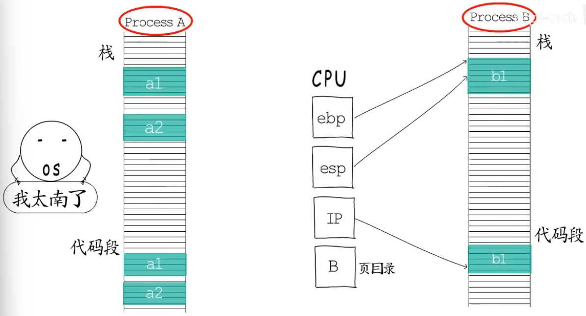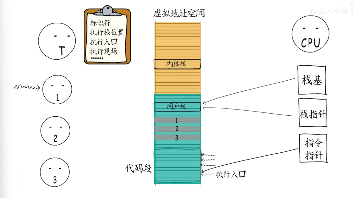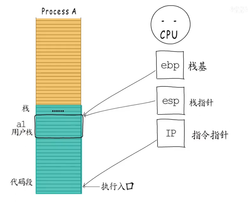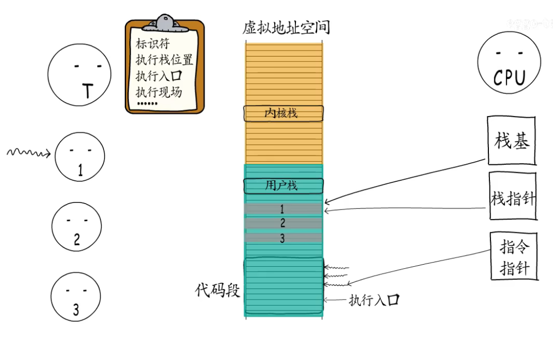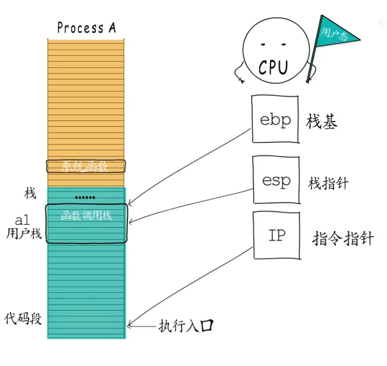 如果接下来要执行进程a中的线程a1,指定执行入口,CPU的指令指针就会指向线程的执行入口,当前执行用户空间的程序指令,所以栈基和栈指-针寄存器会记录用户栈的位置。可以看到程序执行时CPU面向的是某个线程,所以才说线程是操作系统调度与执行的基本单位。