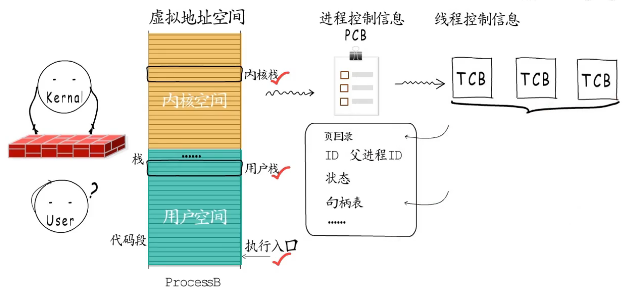 操作系统也会记录每个线程的控制信息,例如执行入口、线程栈(用户栈和内核栈)、线程ID等等。在Windows中,线程控制信息对应TCB,在PCB中可以找到进程拥有的线程列表。同一个进程内的线程会共享进程的地址、空间和句柄表等资源。