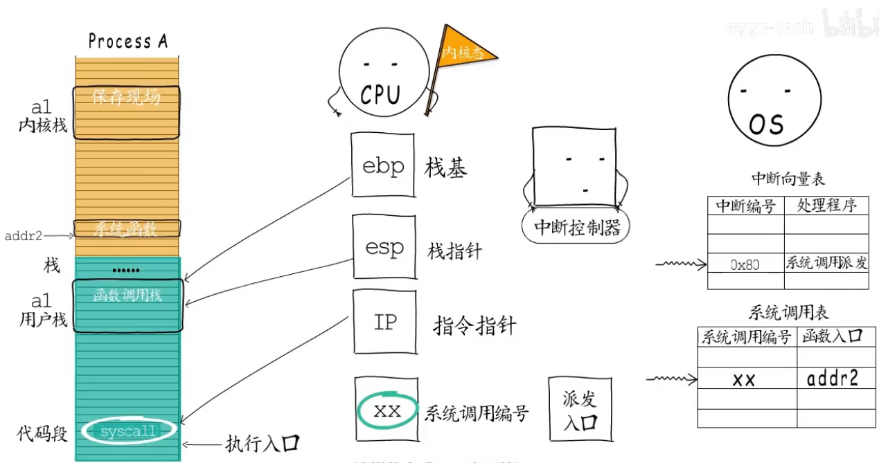 | 核心流程 | 通过查询中断向量表找到系统调用派发程序 | 直接从专用寄存器获取派发程序入口 |