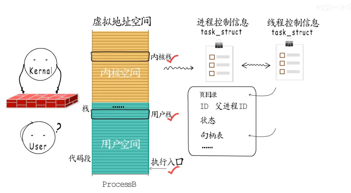 内核空间由所有进程的地址空间共享,但是用户程序不能直接访问内核空间。操作系统保存的进程控制信息自然是在内核空间,这里除了页目录以外,还可以找到很多重要的内容,例如进程和父进程的ID 状态,打开文件句柄表等等。