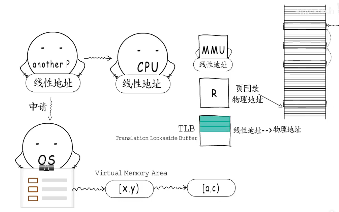 既然进程使用的都是线性地址,那么程序执行时CPU拿到的也是这样的线性地址,而线性地址到物理地址的转换会交由CPU中的内存管理单元(MMU)负责,当前进程持有的页目录的物理地址会被保存到特定寄存器,这样CPU就可以借助页目录和页表把线性地址转换成物理地址了。此外,由于频繁查页表会影响效率,CPU会把当前进程已经转换过的地址映射关系缓存到TLB中,需要转换地址时,先去TLB中查找,没有的话再去查页表,然后写入TLB。如果要切换到另一个进程执行,那么寄存器存储的页目录也会改变,之前的TLB缓存就会失效,需要重新查询页表,建立新的缓存数据,这也是进程切换代价比较高的一个原因(TLB缓存失效)。