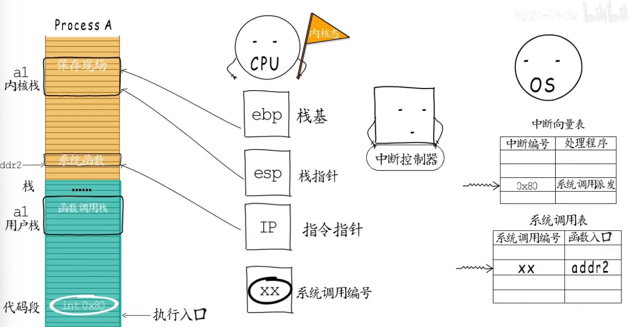 | 触发方式 | 执行软件中断指令 int 0x80 |