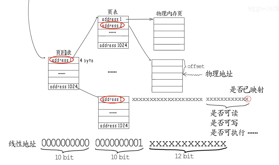 如何定位到一个具体的内存呢?一个32位的线性地址中 ,这10位可以从页目录中选择一个页表(10位是因为页目录总共也就1024个页表),接下来的10位又可以从对应页表中锁定一个物理内存页(10位是因为页表的指向总共也就1024个),最后剩下的12位会用来存储一个相对于内存页起始地址的偏移值(一个内存页有4K大小,那么就有有4K个地址,定位到一个具体的地址只需要12位就行了)。12位正好覆盖4K个偏移值,也就足够定位到这一页的每一个地址了。这样就实现了虚拟内存中一个内存页到一个物理内存页的映射。