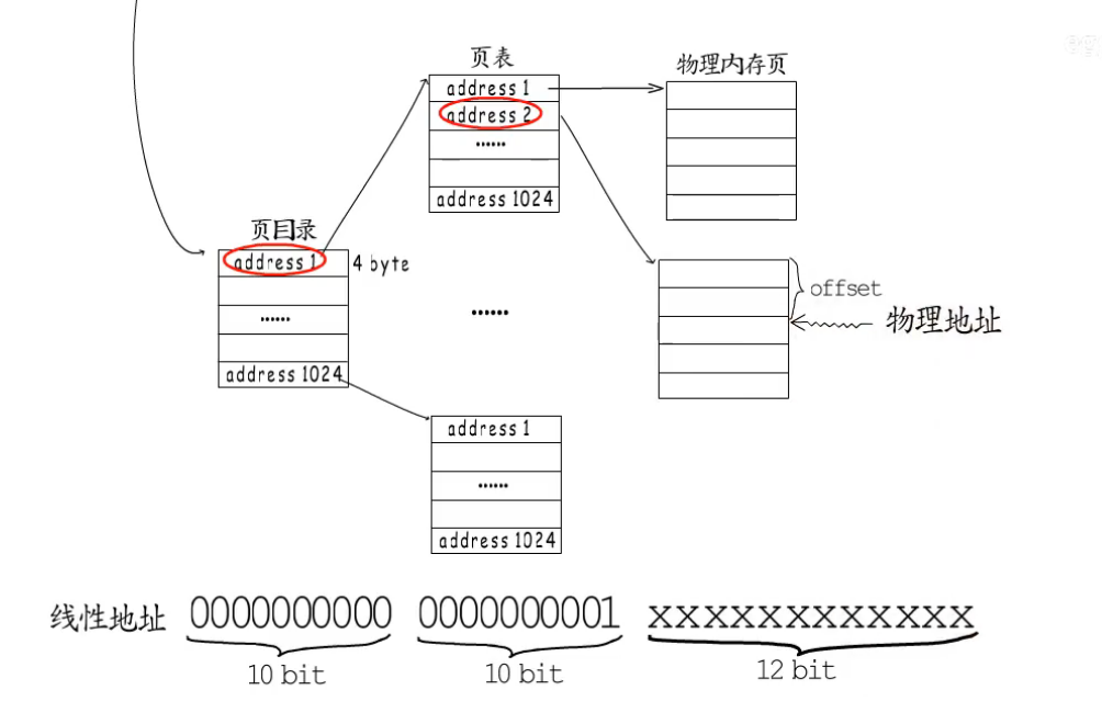 页目录也是一个内存页,存储的是一系列指针,指向同样用来存储物理内存页起始地址的页表,32位下一个内存地址占4字节,一个页目录就可以寻址1024个页表(一个内存页4K,4K / 4byte = 1024个),而每个页表又可以寻址1024个物理内存页,每个页4K,这样正好等于4G,也就是说32位下只需要有这样两级页表,就足够寻址4G大小的内存空间了。