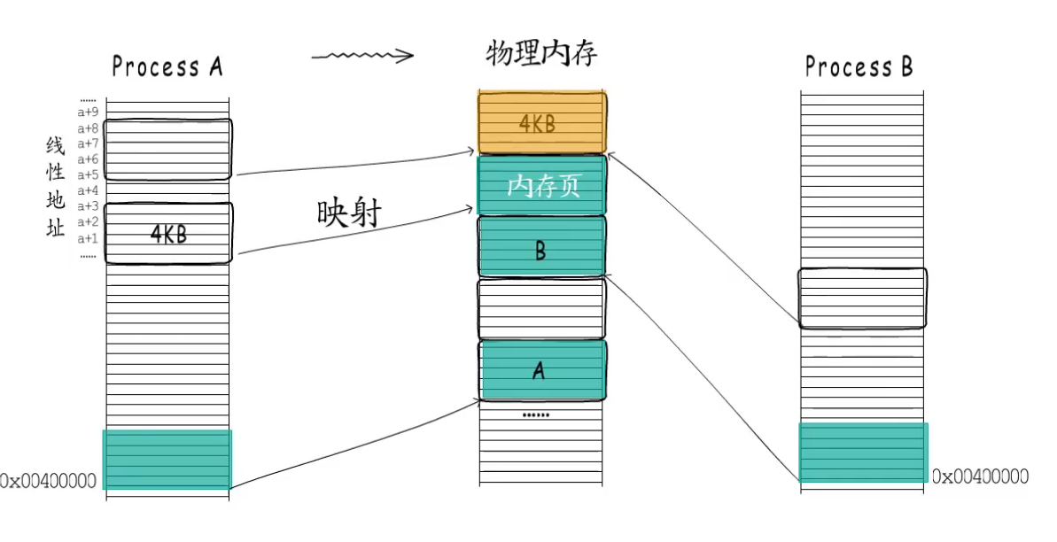 这样就实现了虚拟内存中一个内存页到一个物理内存页的映射。不仅没有在进程中直接使用物理内存地址,而且每个进程对应自己的页表,这样在不同进程中相同的线性地址也会被映射到不同的物理地址,从而实现进程地址空间的隔离。还可以通过把同一组物理页面映射到不同进程的页表中来实现进程间共享内存。