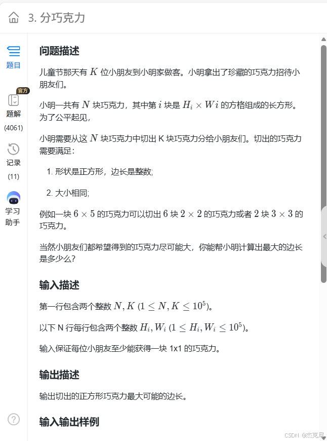 儿童节分巧克力的问题,核心是在 "切出 K 块相同正方形巧克力" 的约束下,找到最大的正方形边长。这个问题的本质是 **"最大化最小值"** 的经典场景 ------ 我们需要让每个小朋友拿到的巧克力尽可能大,但必须保证至少能切出 K 块。