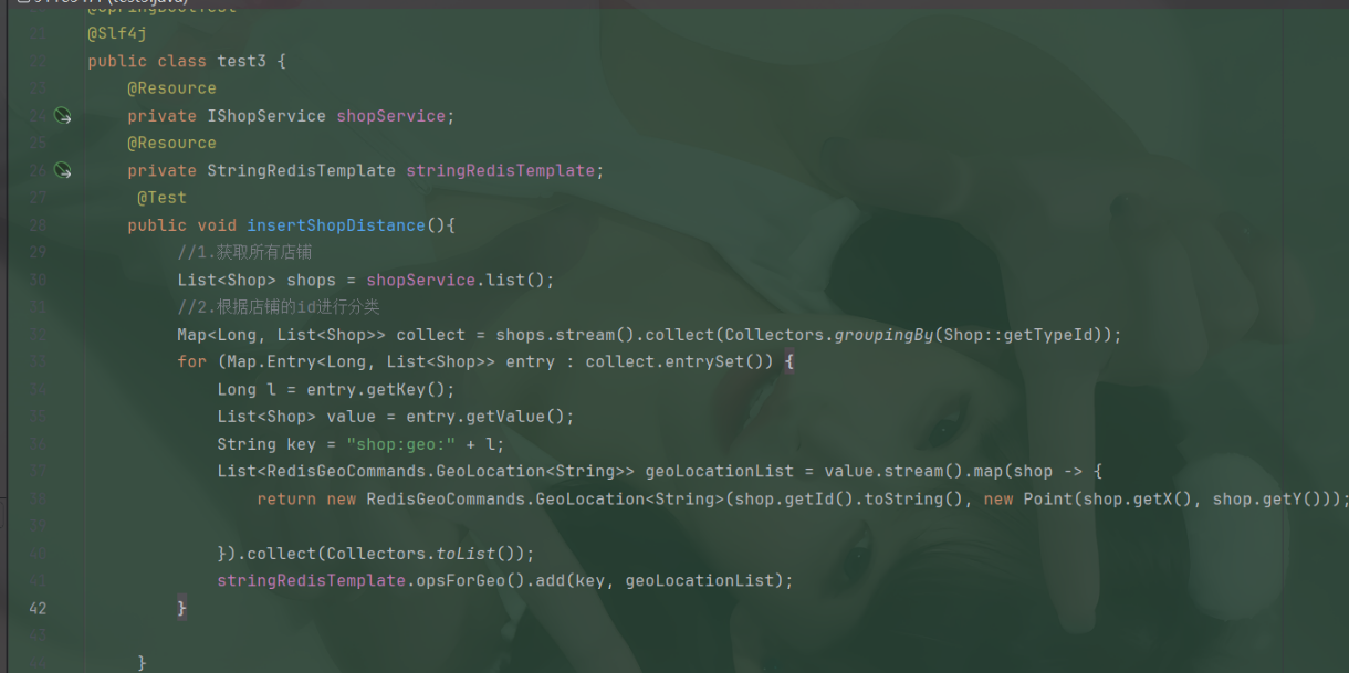 这里先获取到所有商户,因为我的商户类型肯定是需要按照一样的在一块排序,所以我下面就使用stream流的下游收集器来进行收集,不懂的可以看看主包的stream流篇章,里面有详细解释,我拿到stream流后得到的是map,去遍历一下,将里面的·字段存到redis里面就行,这样就完成了关于商户数据的导入