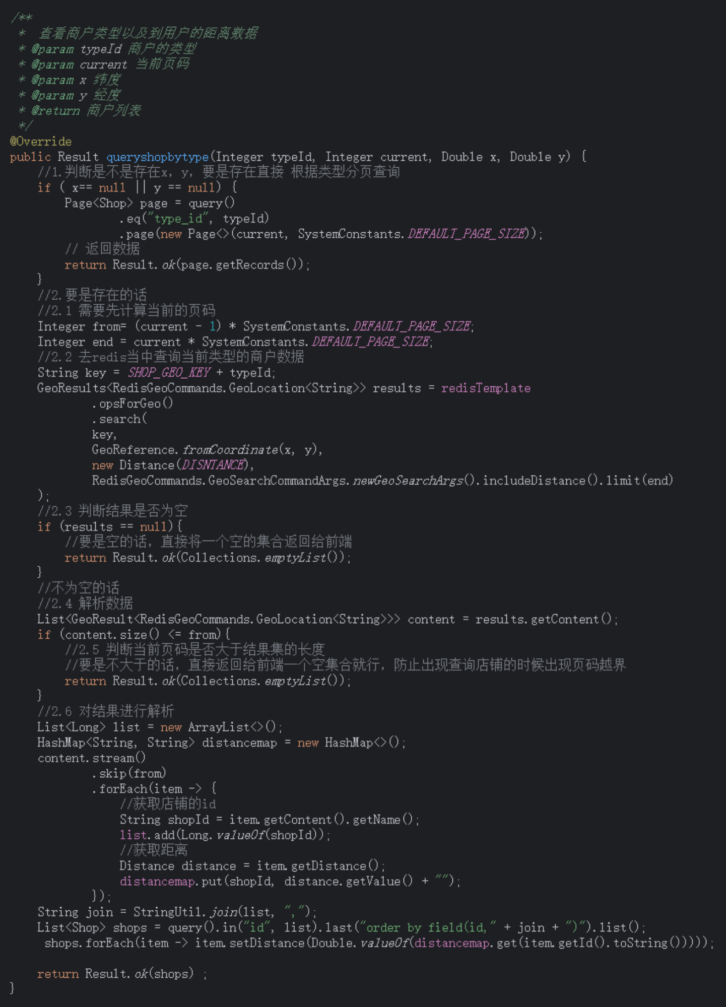 ,接下来我们取判断是不是我从redis取出来的是空集合,要是空集合的话,我直接返回给前端一个空集合就行,要是不是的话,这时候我就需要取解析里面的数据,然后封装给我的商户,当然,这里做出了多一步的判断,要是我的页码是不是大于结果集的长度,因为这时候要是大于的话,我得到的null,再去数据库中查找的话,是不是就会疯狂报错?所以这里先判断一下,然后我就需要取遍历,获取店铺的id,距离,最后取数据库中查找,封装给店铺