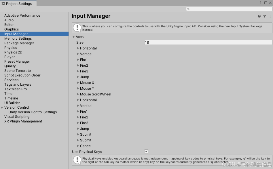 这是Unity内置的、历史悠久的输入系统,通过预定义的"虚拟轴(Virtual Axes)"和"按钮(Buttons)"来工作。