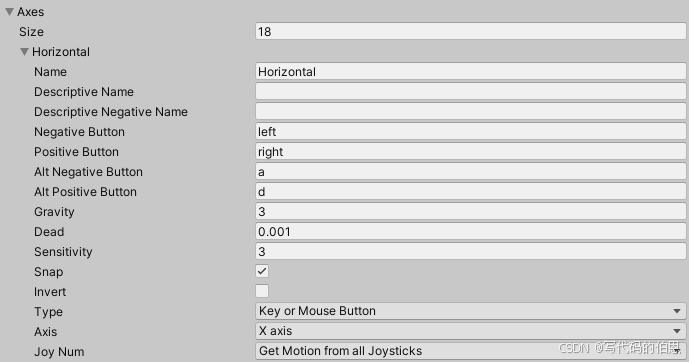 配置内容:在这里可以看到预定义的轴(如Horizontal,Vertical, Fire1)并可以创建新的。每个轴可以绑定多个正向(Positive Button)和负向(Negative Button)按键,甚至可以绑定鼠标移动和手柄摇杆。