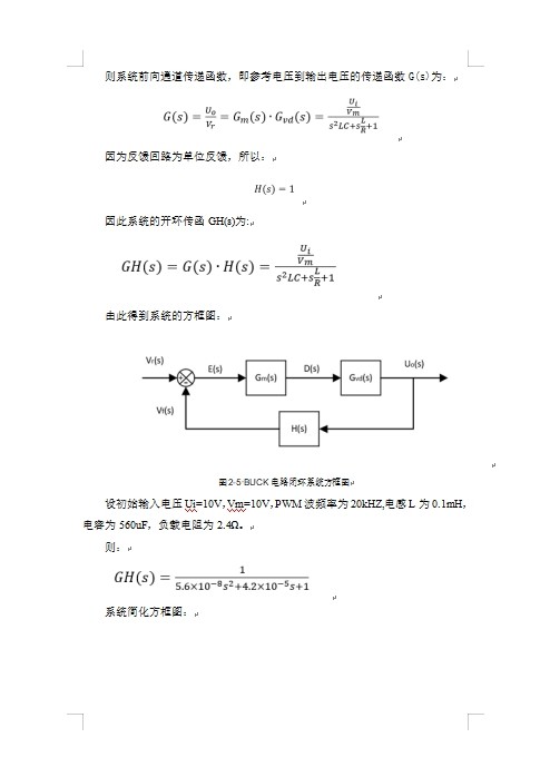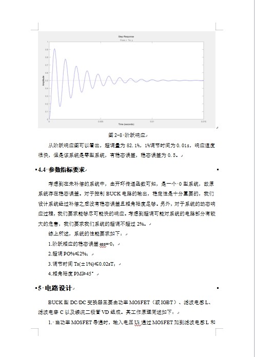 基于MATLAB的BUCK型DC/DC变换器系统设计 本设计包括设计报告,仿真程序。 参数指标要求 考虑到在未补偿的系统中,由开环传递函数可知,是一个 0型系统,故原系统存在稳态误差。 对于控制BUCK电路的输出,稳定性是十分重要的,我们设计系统经过补偿之后没有稳态误差且相角裕度足够。 另外,对于系统的动态响应过程,我们要求能够尽可能快的响应。 考虑到超调可能对系统的电路部分有较大的危害,我们要求我们系统的超调不超过2%。 综上所述,系统的性能要求如下: 1.阶跃相应的稳态误差ess= 0; 2.超调PO%≤2%; 3.调节时间Ts(±1%)≤0.02sT; 相角裕度PM≥45°