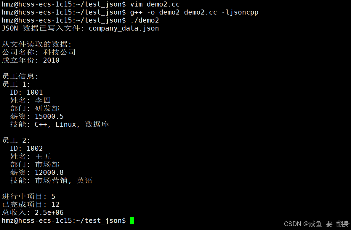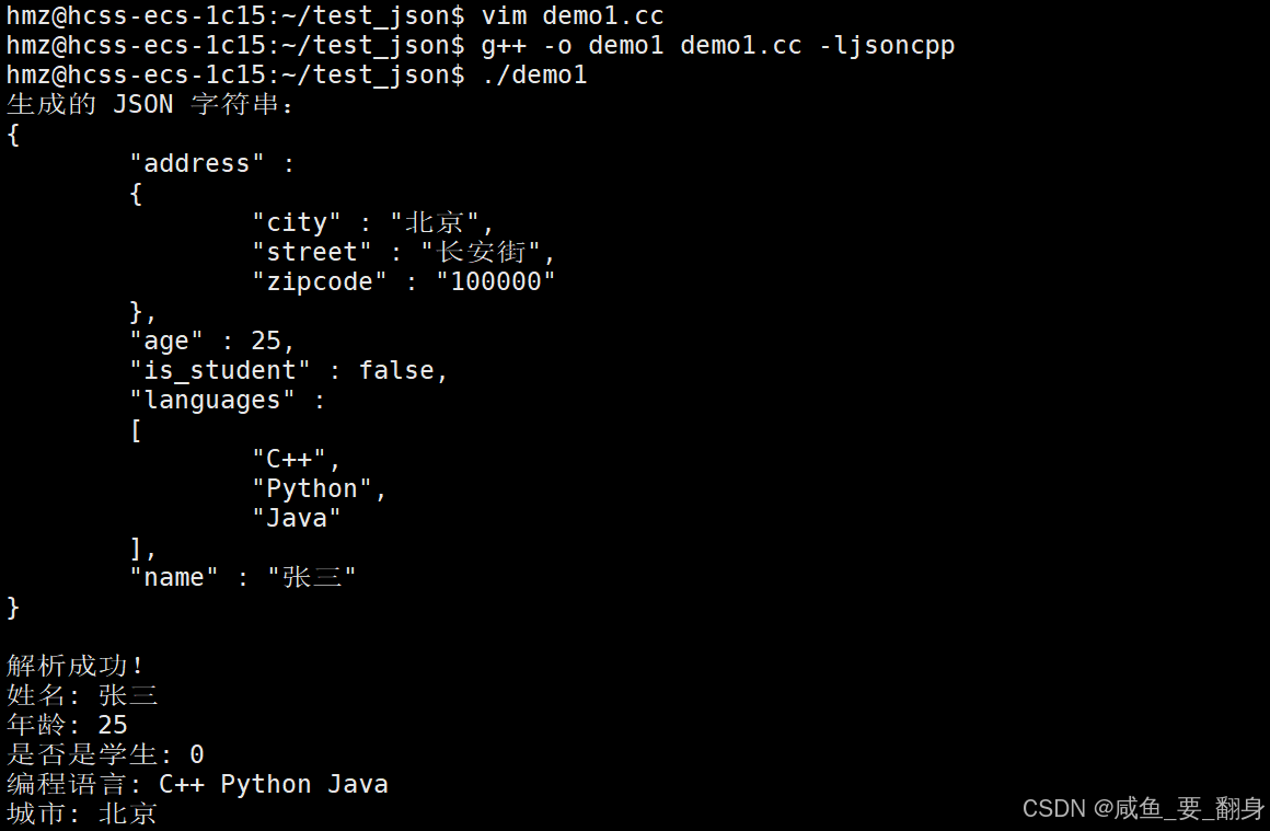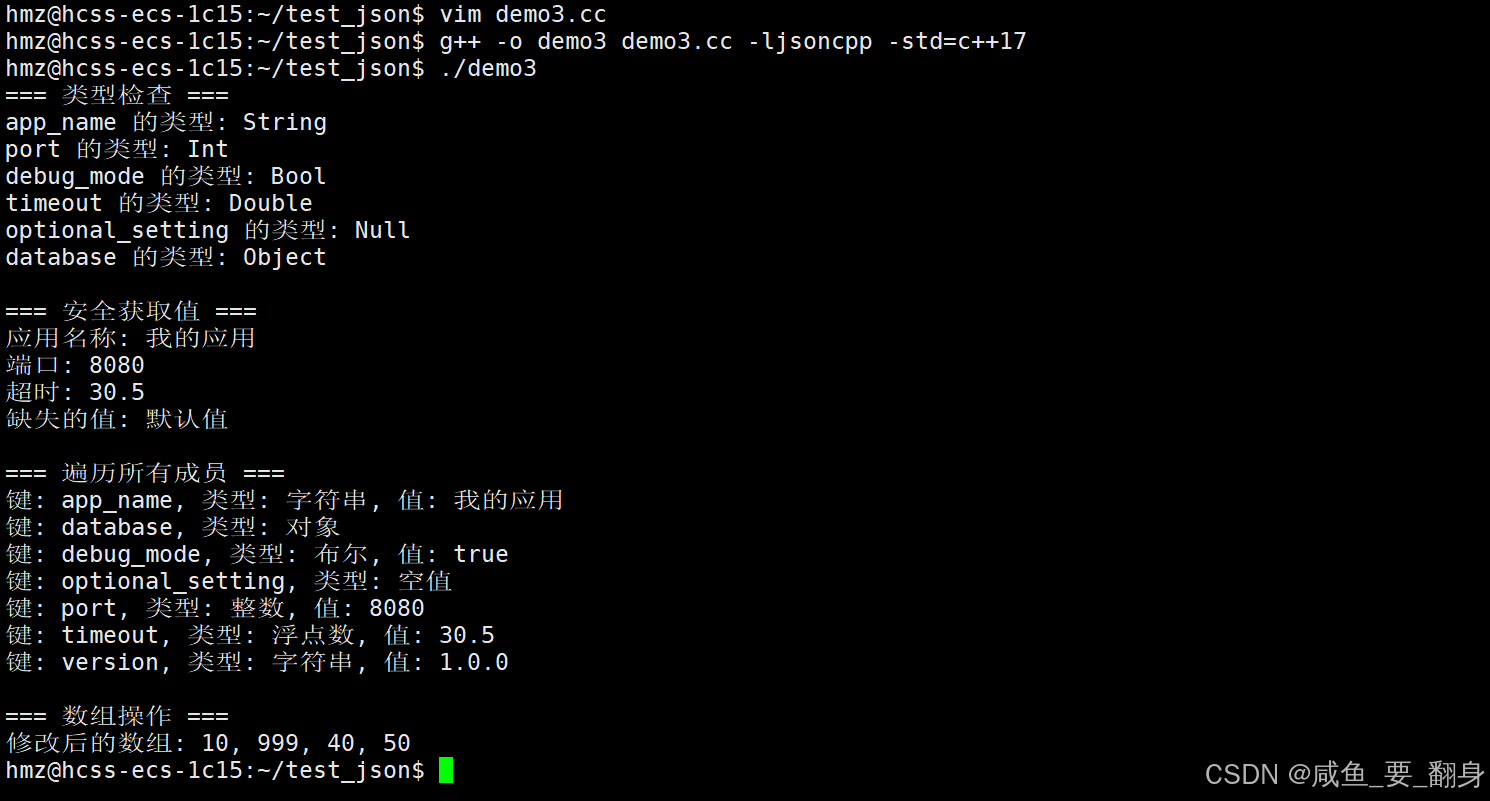 这些示例涵盖了 JsonCpp 的主要功能,包括创建、解析、文件读写、类型检查、安全访问等常用操作。
