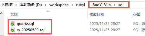 drop database if exists ruoyidb; create database if not exists ruoyidb default character set utf8mb4 default collate utf8mb4_bin;(2) 找到 \RuoYi-Vue\sql 文件夹下的两个 SQL 文件: