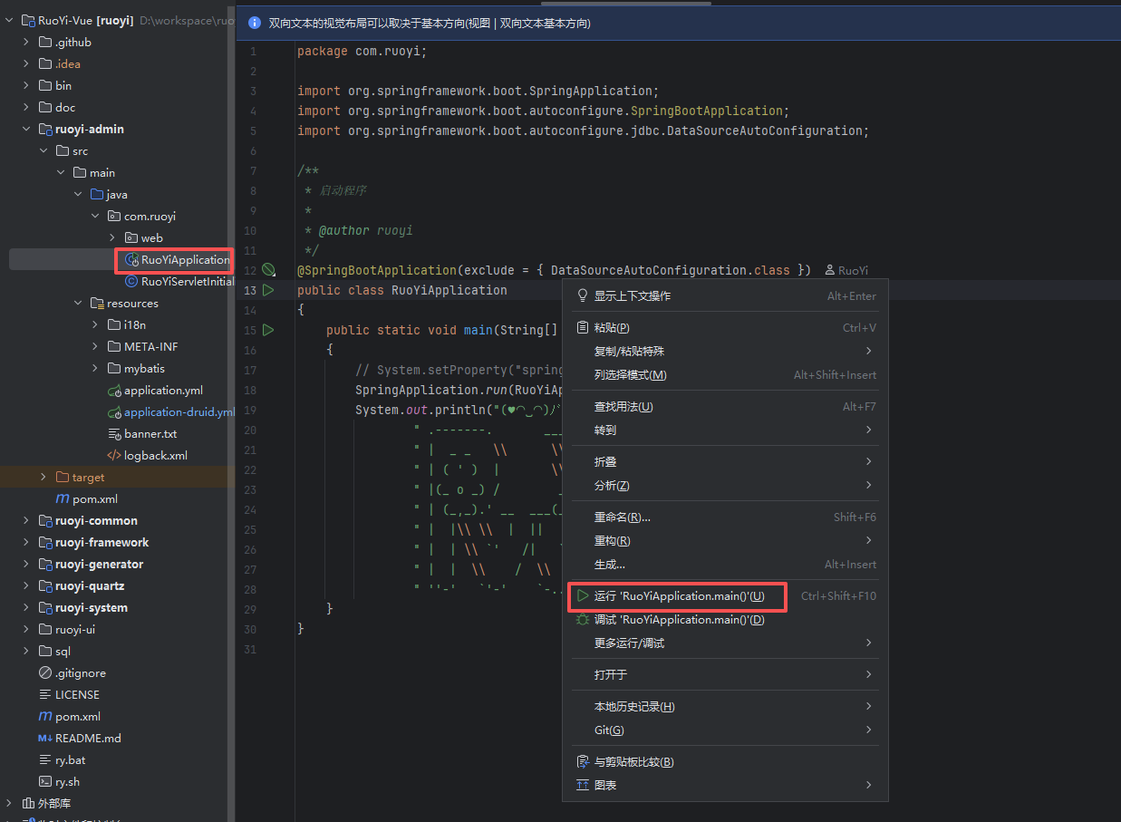 (1) 找到启动类RuoYiApplication,右键点击这个类,选择"运行 RuoYiApplication.main()":