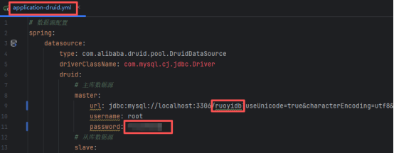 (4) 找到 application-druid.yml 数据库配置文件,修改数据库名称,和root用户密码: