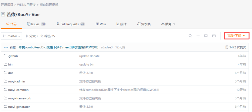 - 打开若依前端分离版(RuoYi-Vue)源码地址: