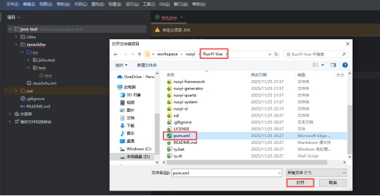 (1) 打开 IDEA,依次点击 "文件 ---> 打开",选择 "RuoYi-Vue文件夹" 下的 pom.xml 文件后,点击 "打开" 按钮:
