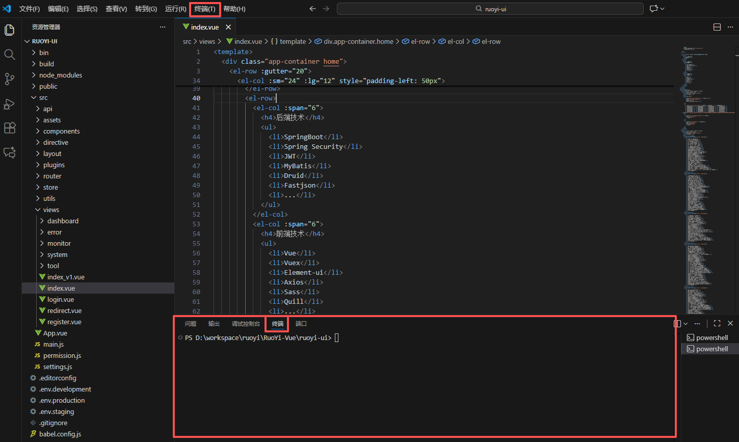 (1) 打开 VS Code,依次点击 "文件 ---> 打开文件夹",选择 RuoYi-Vue 文件夹下的