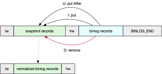 当某个表被读取的Binlog时间戳大于此表snapshot阶段完成的max(table split high watermark)时,此表进入PureBinlog阶段,后续binlog变更直接发送到下游。