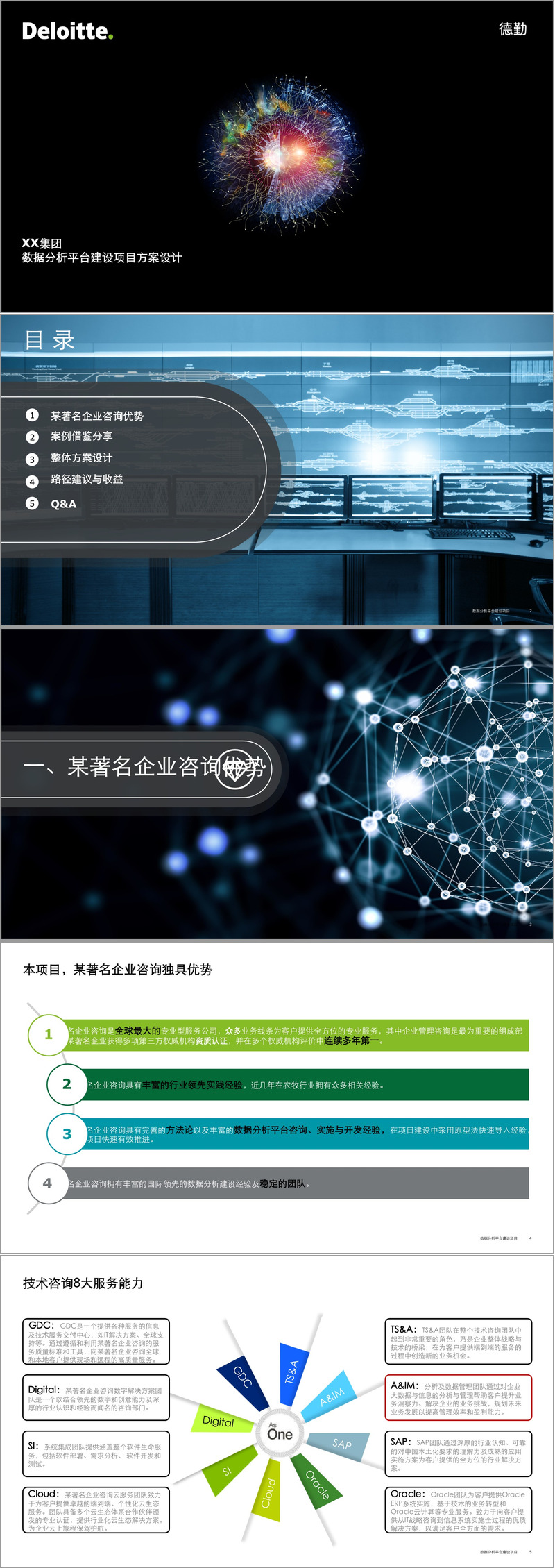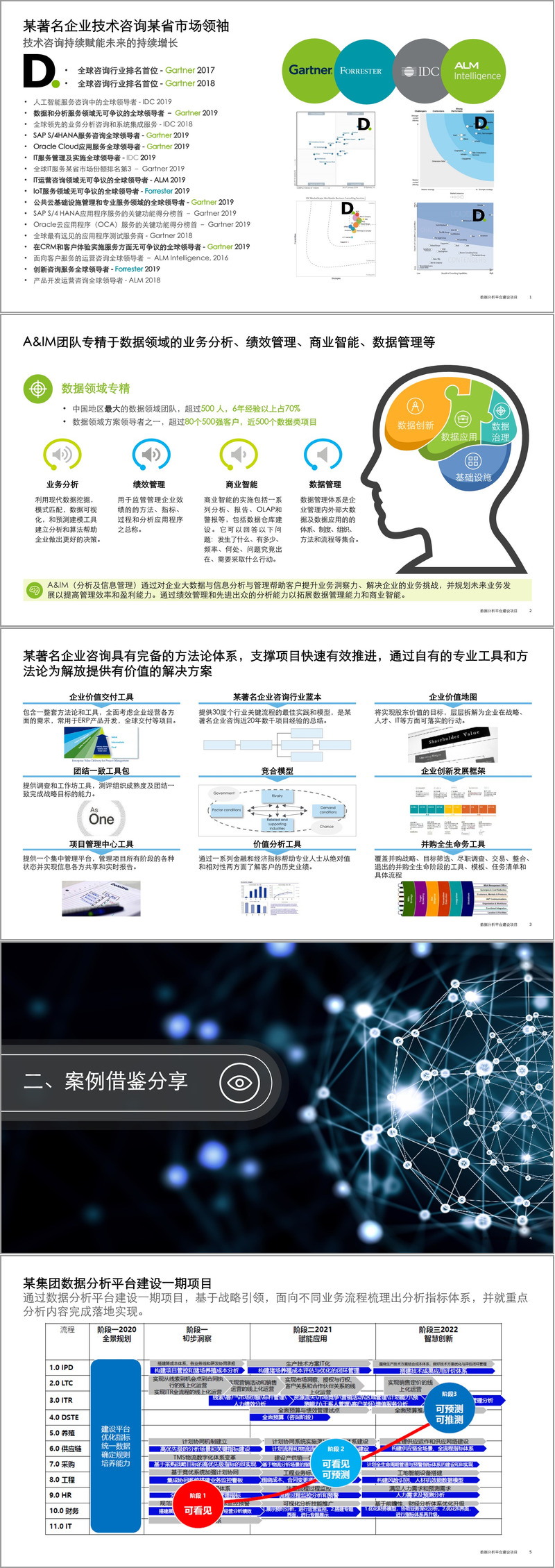 某著名企业咨询在项目中具备显著优势,依托技术咨询八大服务能力,涵盖 SAP、Cloud、GDC 等多个专业团队,可为项目提供全方位技术支撑。其在全球咨询行业稳居领先地位,尤其在数据和分析服务领域具备深厚积淀,A&IM 团队作为数据领域专精力量,拥有超 500 人的专业团队和近 500 个数据类项目经验,结合完备的方法论体系与自有工具,能确保项目快速有效推进。