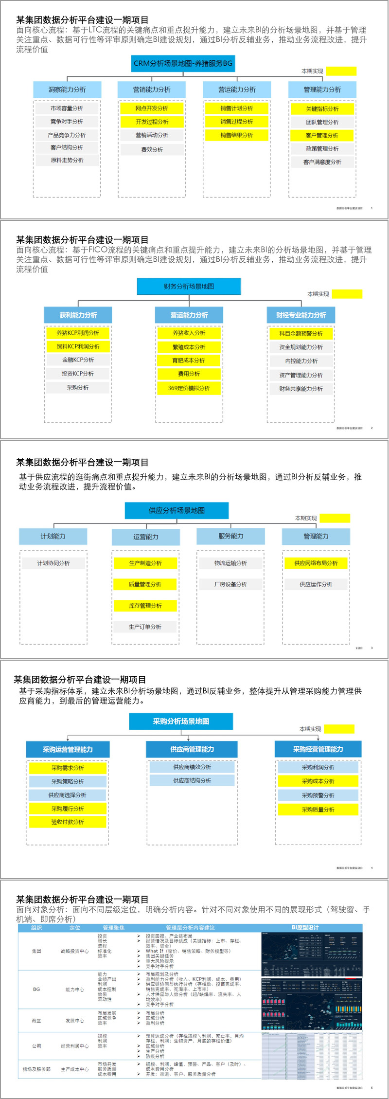 整体方案设计遵循 "一个数据平台、一套指标体系、一套数据标准" 的核心原则。指标体系构建采用自上而下与自下而上相结合的方式,基于集团战略分解指标,同时结合数据现状调研补充完善,明确指标定义、计算公式、分析频率与责任部门,形成覆盖全业务流程的完整指标库。数据平台架构兼顾当下需求与远期拓展,近期实现手机端关键指标展示、PC 端自主分析、固定格式报表导出等功能,远期将构建包含数据中台、数据管理、数据服务等模块的高扩展性架构,支持结构化与非结构化数据的全面整合。数据标准建设聚焦主数据、业务数据与指标数据的统一,建立数据管理机制与认责机制,确保数据质量与安全。