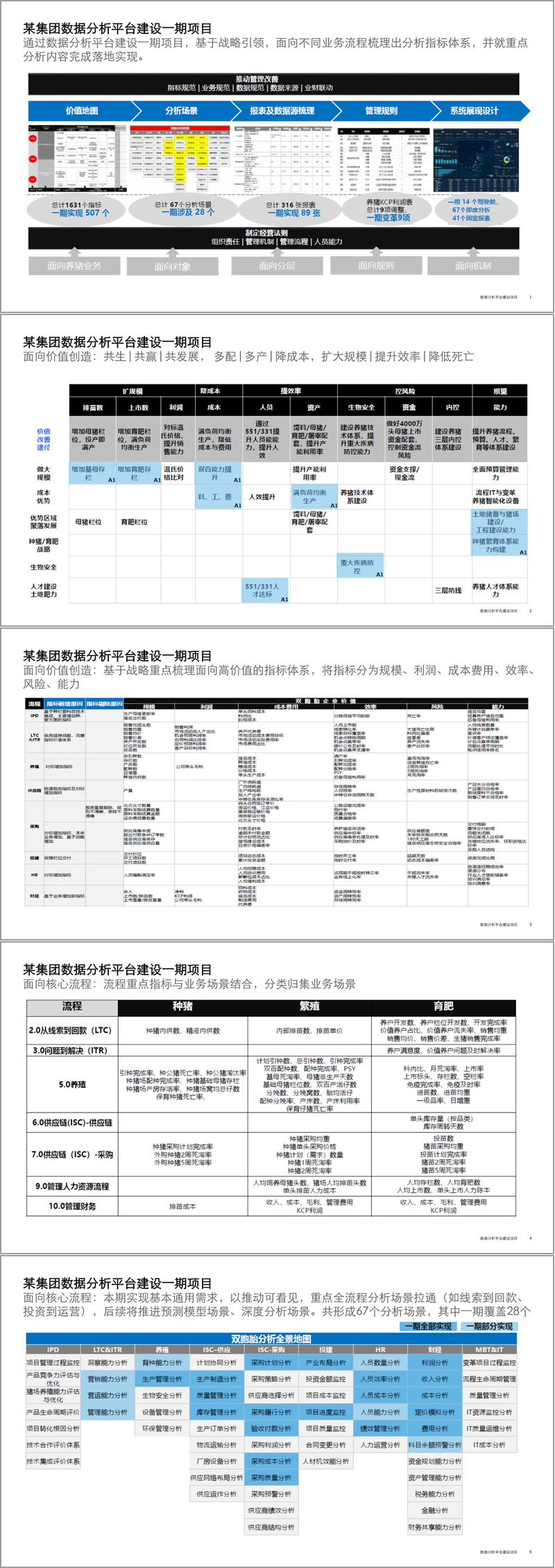 案例借鉴部分以某集团数据分析平台建设一期项目为参考,展现了成熟的建设路径。该项目基于战略引领,梳理出覆盖规模、利润、成本费用、效率、风险、能力六大类别的指标体系,聚焦 LTC(线索到回款)、FICO(财务会计)等核心流程,形成 67 个分析场景,一期落地 28 个。通过面向不同组织层级设计差异化分析内容与展现形式,实现了指标体系、报表清单的系统化梳理,为 XX 集团项目提供了可直接参考的实践样本。