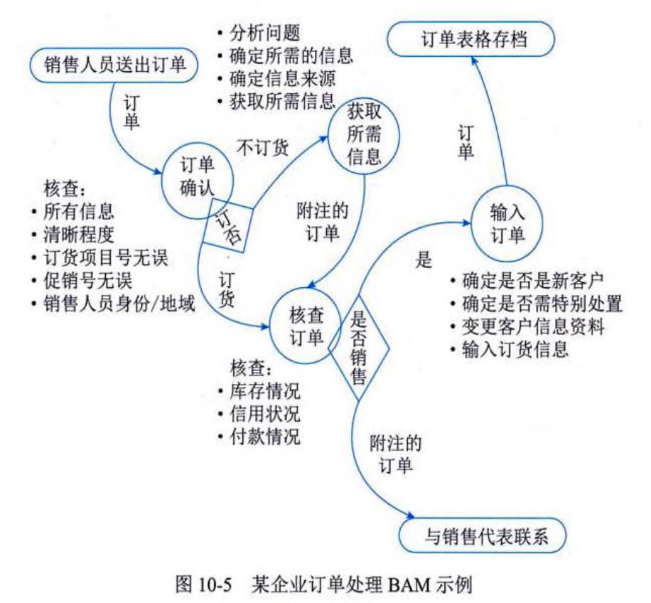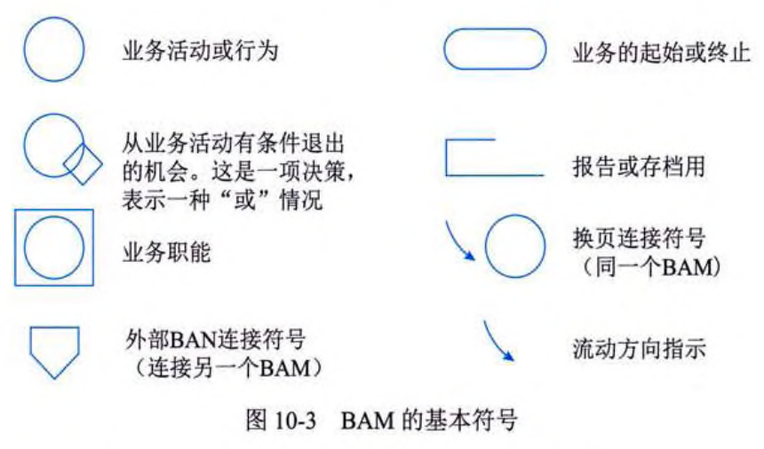 BAM 主要功能是提供业务流程情况的全面模型。该模型不但有图例表述业务活动流动的情况,还能提供相关的业务活动细节。BAM 的具体应用主要有三个:一是在业务流程调查时,可以用 BAM 对业务流程进行识别;二是在业务流程分析时,可以用 BAM 描述新的业务流程;三是在业务流程实施过程中,可以用 BAM 实现业务流程的不断优化。